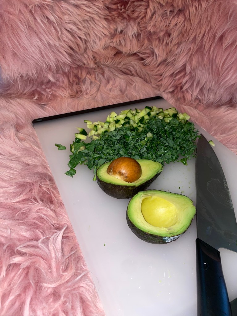- Cut the avocado in half, then set everything to the side