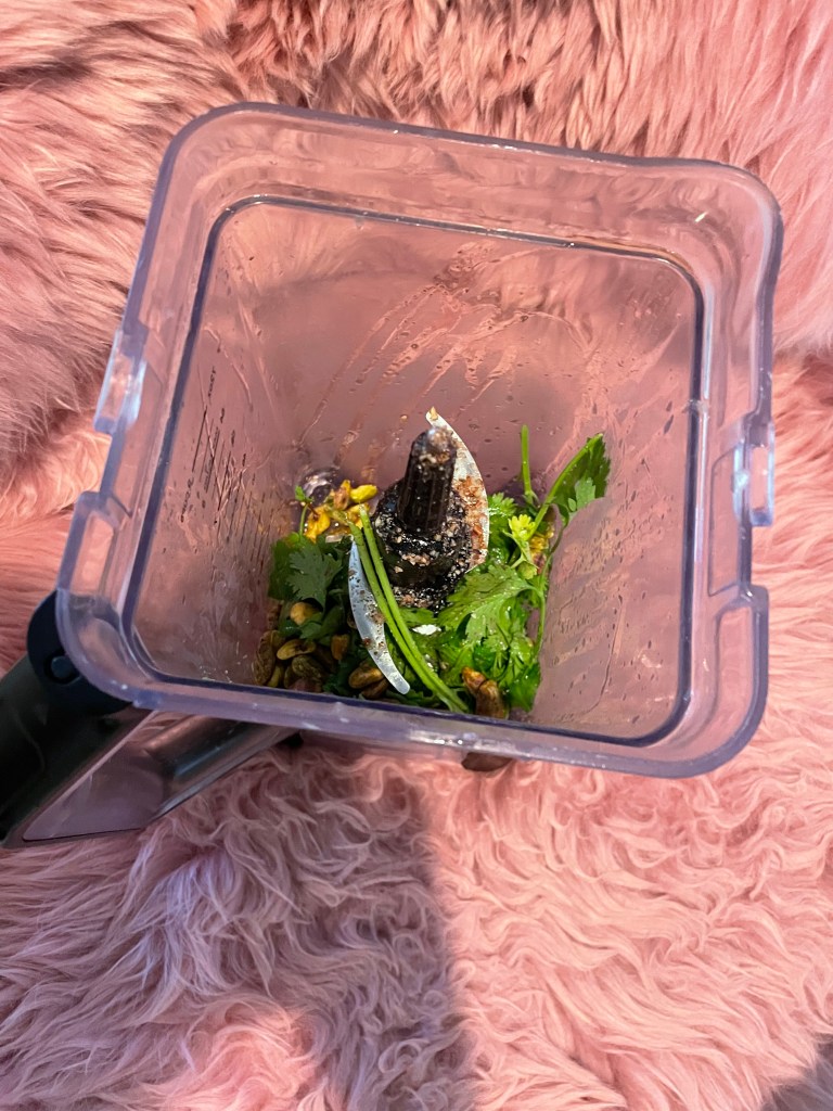 4. Throw the cilantro, avocado, olive oil, lime juice, pistachios, walnuts, and water in the ninja and blend till smooth