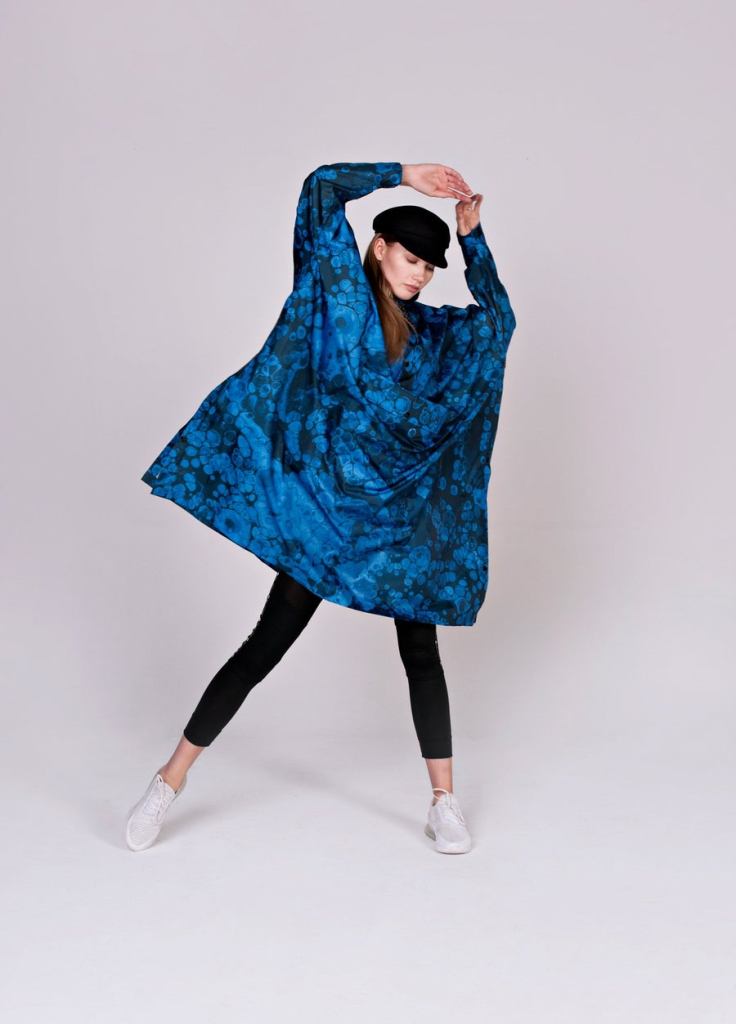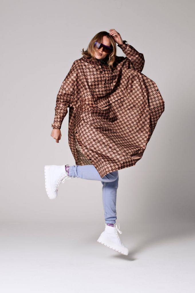 This brand is 100% RECYCLED POLYESTER. It is called rain kiss and it is THE CUTEST. So I felt like I had to share. Stay away from getting wet in a cute poncho.